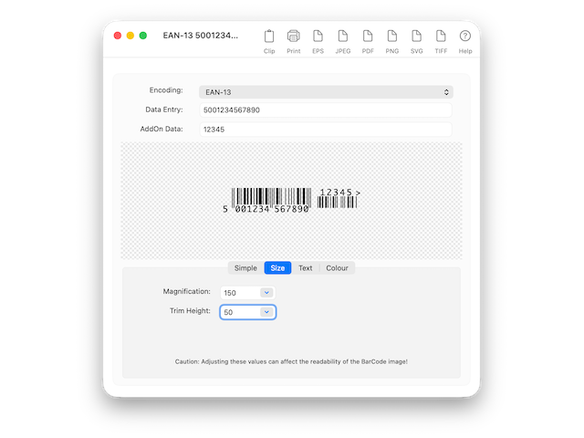 (Back) Features Reference The Toolbar that appears on each Scorpion BarCode window allows quick access to commonly used features. Items that appear under the Menu bar can also be used to access commonly used features. The advanced editing tabs provide access to editing options for the final Barcode image. Care should be exercised when selecting the advanced editing features as excessive adjustments away from the original specifications can make a Barcode unreadable. Features available via the Toolbars, Menu items, and advanced editing tabs include: Clip Saves a copy of the Barcode image on the clipboard ready for pasting into other application programs. Prints the Barcode image in camera-ready artwork format. EPS Saves the Barcode image as a resolution-independent vector EPS file that can be imported or edited in other application programs. This is the preferred format for the professional print industry and expected by professional DTP layout programs. JPEG Saves the Barcode image as a bitmap image JPEG file that can be imported into other application programs. Please note that bitmap images do not scale effectively and should not be used for high-resolution printing purposes. Saves the Barcode image as a resolution-independent vector PDF file that can be imported or edited in other application programs. This is the preferred format for general macOS purposes such as placing the image in other application programs. PNG Saves the Barcode image as a bitmap image PNG file that can be imported into other application programs. Please note that bitmap images do not scale effectively and should not be used for high-resolution printing purposes. Transparency and alpha channel are preserved. SVG Saves the Barcode image as a resolution-independent vector SVG file that can be imported or edited in other application programs. This is a preferred format for web sites and other professional vector layout programs. TIFF Saves the Barcode image as a bitmap image TIFF file that can be imported into other application programs. Please note that bitmap images do not scale effectively and should not be used for high-resolution printing purposes. Transparency and alpha channel are preserved. Help Activates the Apple Help window which displays the contents of this User Guide for your ease of reference. Magnification Provides percentage scaling of the Barcode image. The default position is 100%. Trim Level Provides the option to trim the height of the Barcode image without affecting the widths of the Barcode graphic elements. The default position is 0. Display Text Override Provides the ability to adjust the text shown within the Barcode image. Not applicable in all Barcode symbologies as most specifications are clear that the text must conform to the specifications. However, in some case, some minor manual adjustment is desirable such as placing spaces between some of the characters or brackets around some of the characters to help make the text contents more readily human-readable. Disable Font Smoothing Font smoothing creates a softer edge to the font outline to make the results more visually appealing. Modern printing techniques and display screens have the ability to smoothen fonts directly at the rendering stage and there is no reason to disable the Font Smoothing. The Disable Font Smoothing option is therefore normally kept Off. However, when using older print plate devices which require clear edges, the Font Smoothing feature can be disabled by ticking the box to the On position. Disable Anti-Aliasing Anti-Aliasing creates a softer edge to the Barcode graphic elements outline to make the results more visually appealing. Modern printing techniques and display screens have the ability to anti-alias the graphical objects directly at the rendering stage and there is no reason to disable the Anti-Aliasing. The Disable Anti-Aliasing option is therefore normally kept Off. However, when using older print plate devices which require clear edges, the Anti-Aliasing feature can be disabled by ticking the box to the On position. Bar Colour The standard colour panel provides the option to select any colour available to paint the Barcode graphic elements in the chosen colour. The default specifications for most Barcode symbologies usually calls for pure black but the option to select a colour remains popular to match inks in use on the final output. Background Colour The standard colour panel provides the option to select any colour available to paint the background of the Barcode image in the chosen colour. The default specifications for most Barcode symbologies usually calls for pure white but the option to select a colour remains popular to match inks in use on the final output. The default setting is white but with transparency not disabled so that the background is usually clear. Disable Transparent Background The background colour is selectable but not always desirable. A transparent background allows the Barcode image to adopt the background of the layout where it is placed. In some cases, the background needs to be specified, such as when overlaying on a complex image layout. The default position of maintaining a transparent background can be disabled by ticking the box to the On position where the selected Background Colour will then become the background colour of the BarCode image. Font Name Most Barcode symbologies prefer a mono-proportional font for the human readable text shown as part of the Barcode image. Older specifications called for an Optical Character Recognisable (OCR) font for machine reading of the text though this is now generally redundant in the modern era. The default mono-proportional font historically adopted by macOS computers was Monaco and this remains the default choice in Scorpion BarCode software. Font Size When selecting a Font, care should be taken to ensure that the text rendered is human-readable and does not get clipped by the edges of the Barcode image or superimposed on the